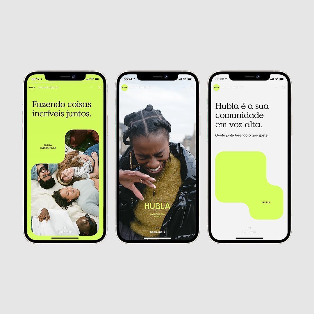 The image displays three mobile app screens featuring a consistent, bright, and modern visual language centered around a vibrant lime green accent. The design is clean, utilizing high-contrast elements and emotive photography to convey a sense of community and authenticity.
