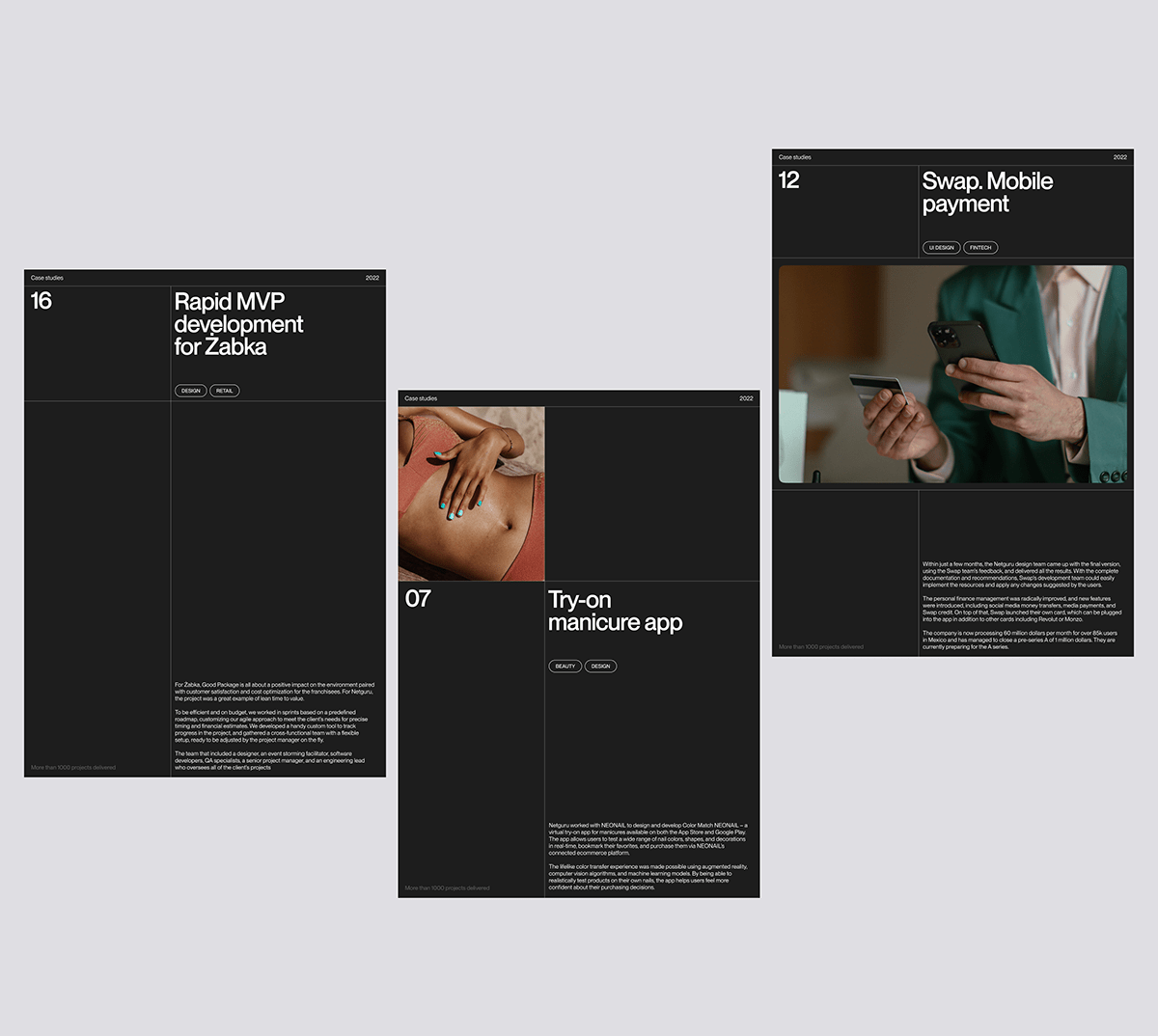 The design employs a clean, professional layout suitable for showcasing technical case studies. It uses negative space effectively to highlight project titles and paired photographic visuals, resulting in a modern, organized, and highly focused portfolio presentation.