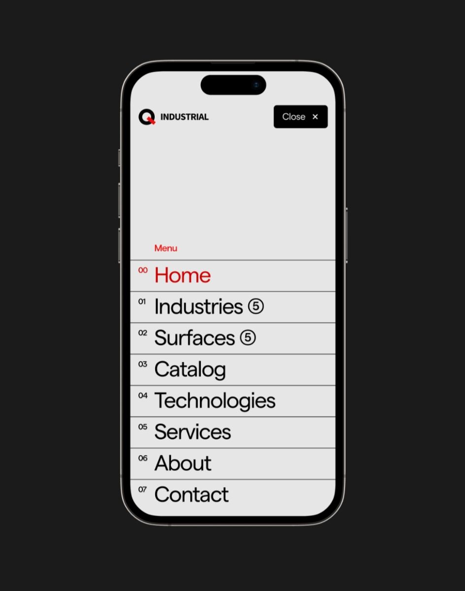 The interface presents a clean, minimalist mobile navigation screen with a stark white background and dark text, emphasizing clarity and functionality. The design relies on simple list items and clear hierarchy to guide the user through main sections.