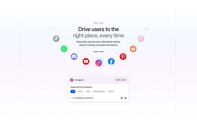 The design is clean, minimalist, and modern, utilizing a light background with subtle, colorful icons to illustrate the concept of 'deep links.' The layout is centered and balanced, focusing attention on the central text and the call to action.
