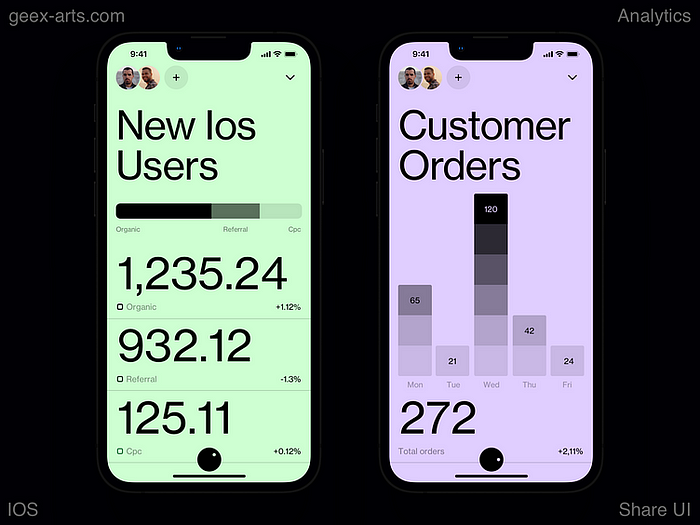 The image displays two mobile app screens, likely analytics dashboards, characterized by a clean, modern, and minimalist design. It uses a light green/mint palette contrasted with white and dark gray elements to present data clearly and efficiently.