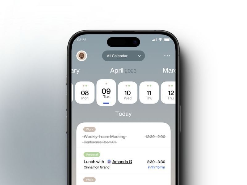 This image displays a clean, modern user interface for a calendar application on a smartphone screen. The design emphasizes clarity and functionality with ample white space, employing a light, minimalist aesthetic typical of contemporary mobile OS design.