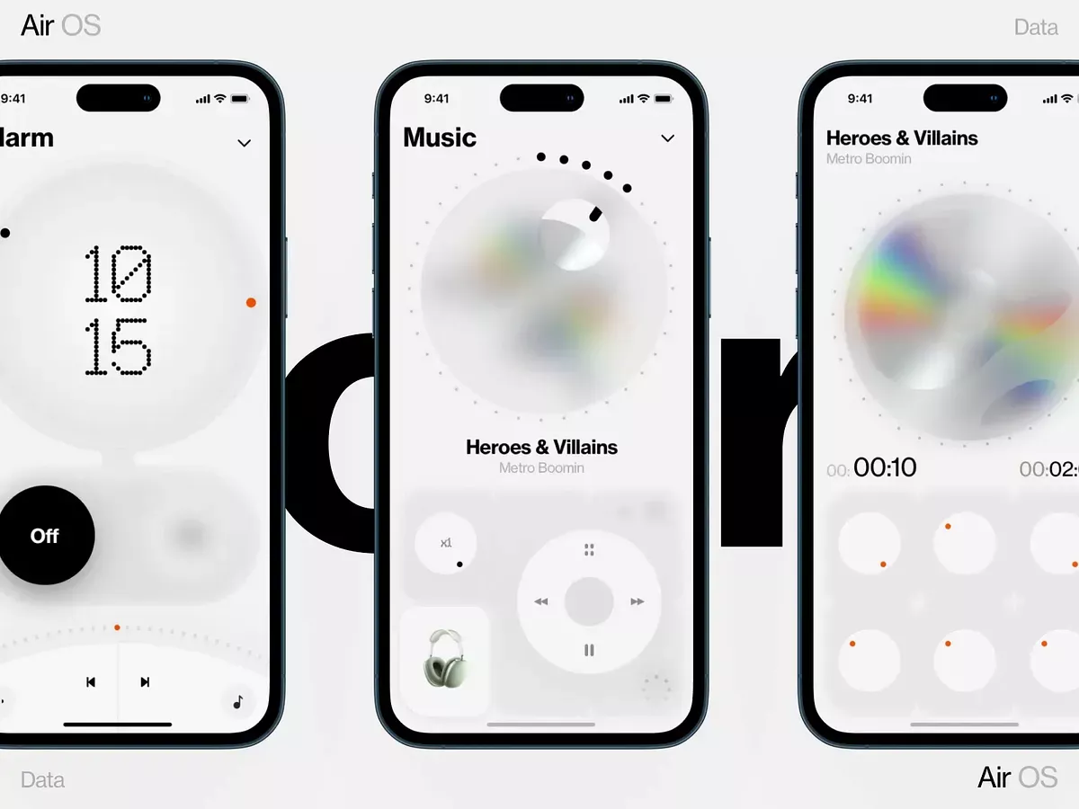 This image showcases a clean, minimalist user interface design for an operating system (Air OS), emphasizing large, circular elements and high contrast against a light background. The visual language is modern, employing subtle gradients and precise iconography to convey functionality.