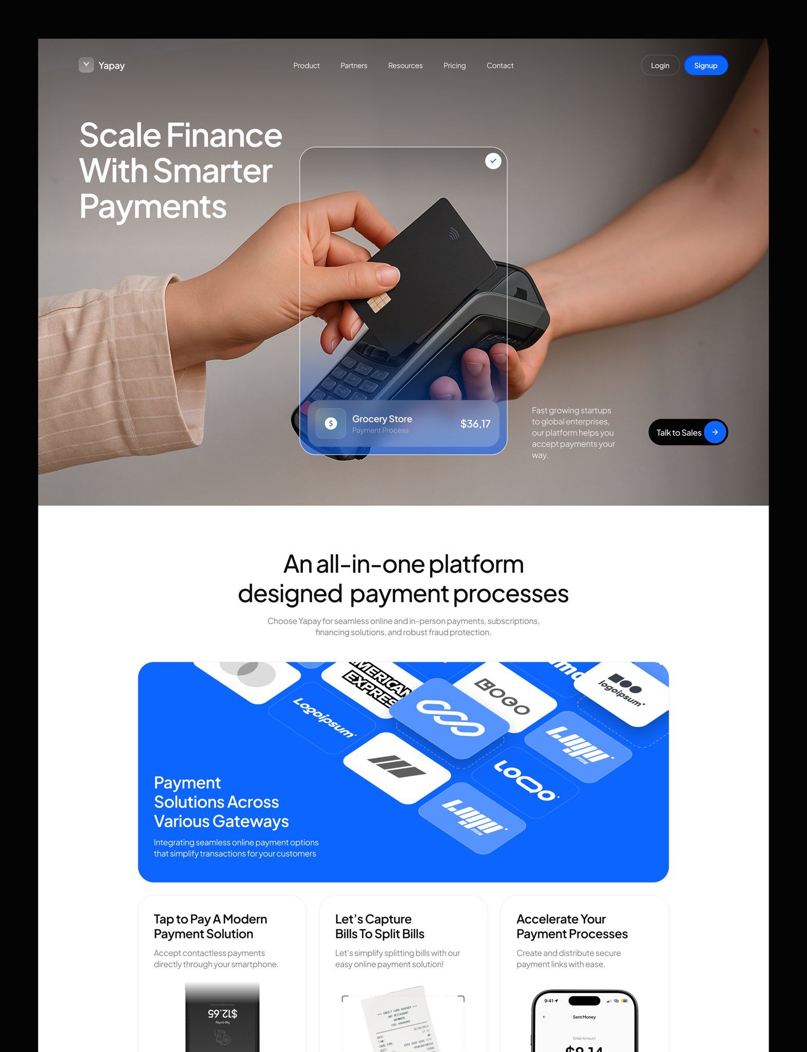 The image presents a clean, modern interface design focusing on mobile payment solutions. The visual language is professional and trustworthy, utilizing ample white space and subtle gradients to guide the user's eye toward the core product demonstration. The overall feel is sophisticated and solution-oriented.