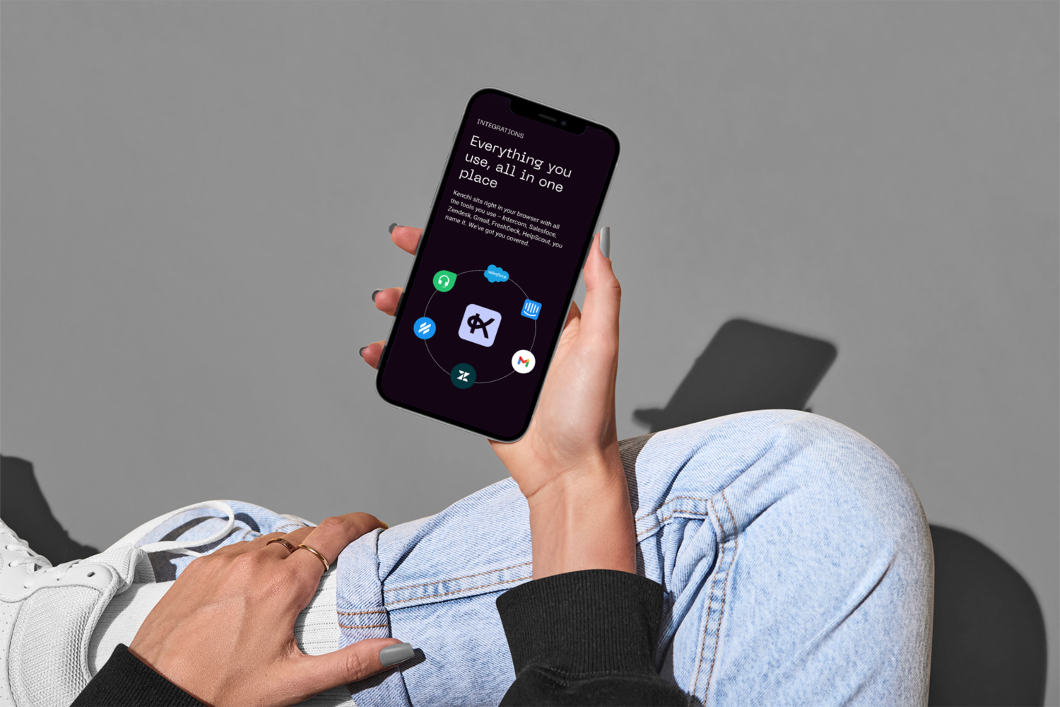 The image features a close-up of a hand holding a smartphone displaying a minimalist user interface, suggesting a focus on mobile technology and clean design. The composition is centered around the device, emphasizing functionality and modern digital interaction.