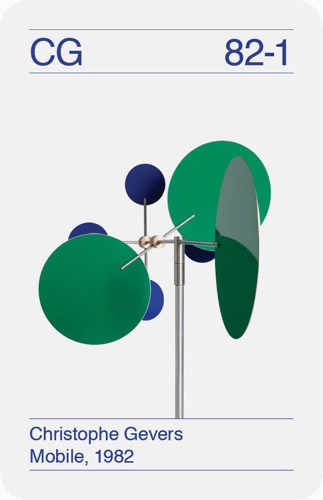 This design features a clean, abstract graphic composed of overlapping organic shapes in deep greens and blues, suggesting movement or calibration. The visual language is precise and geometric, evoking a sense of retro technical design from the early 1980s.