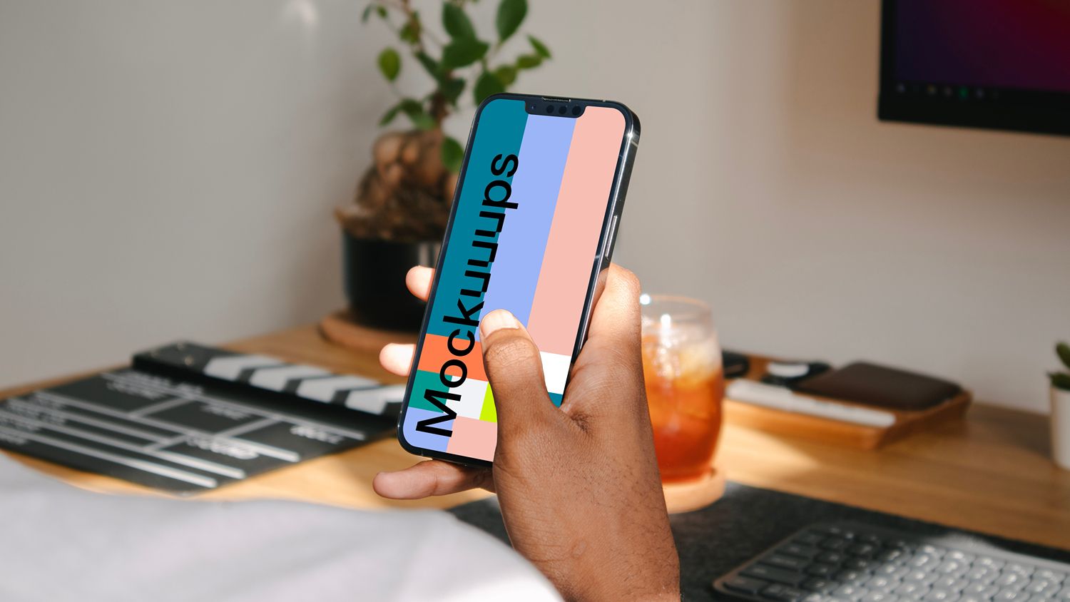 The image features a close-up of a hand holding a smartphone displaying a colorful, abstract graphic. The design emphasizes vibrant color blocking and modern mobile interface aesthetics against a warm, wooden background.