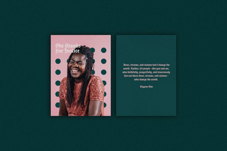 A contemporary two-panel design featuring a portrait-driven left panel with bold typography and geometric accents, paired with a minimalist right panel containing inspirational text. The design employs a striking color contrast between warm pink and deep teal, creating visual tension and modern sophistication.