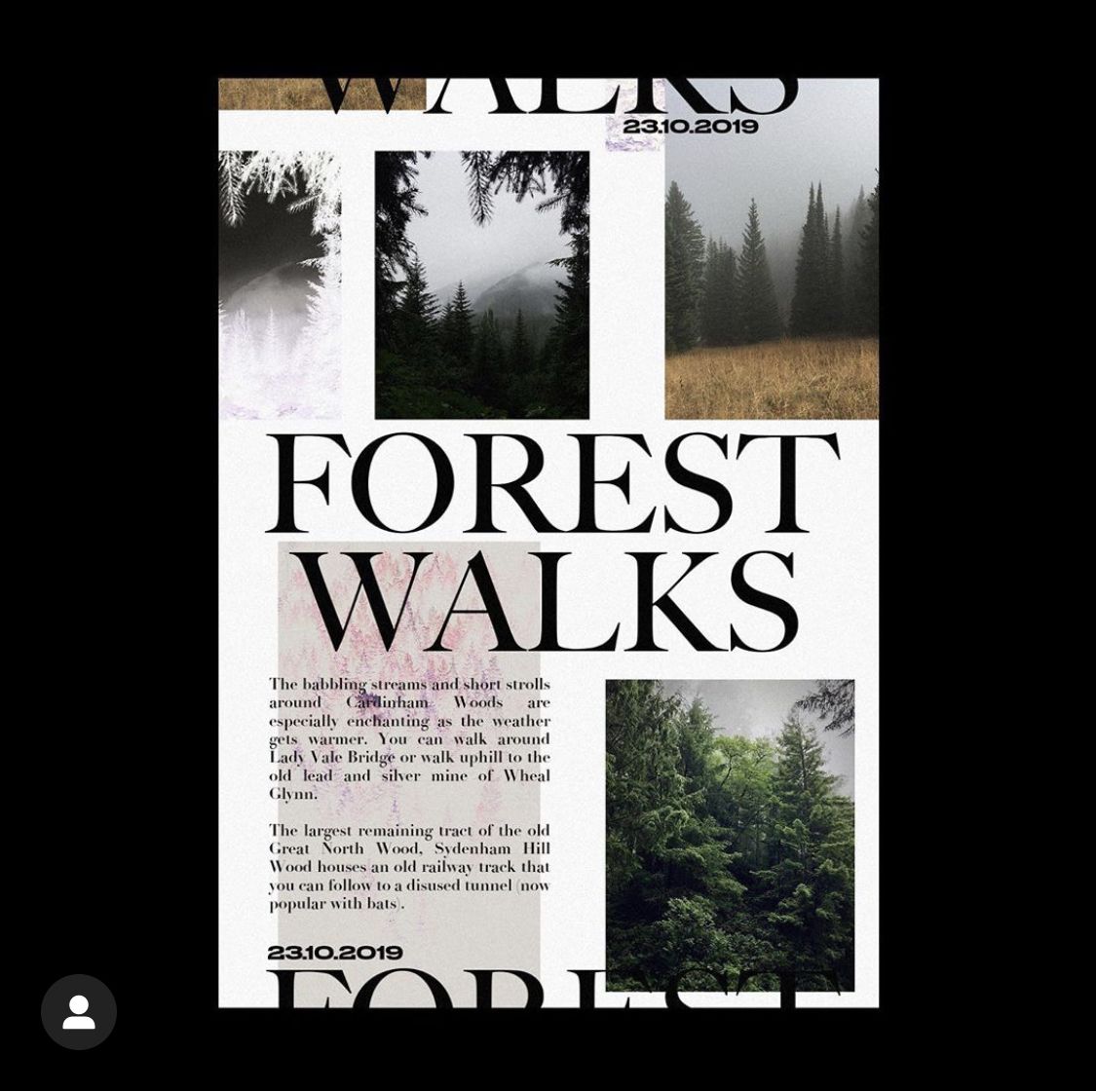 The design employs a minimalist, earthy aesthetic dominated by deep greens and muted tones, suggesting an immersive or natural experience. The layout is clean and structured, using negative space effectively to draw attention to the event details.