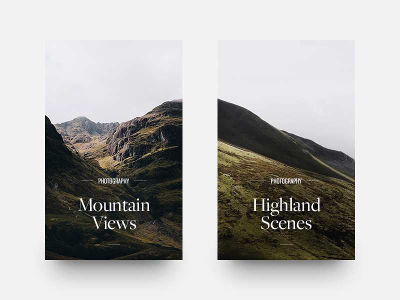 This is a minimalist and evocative photographic portfolio layout featuring two distinct landscape images. The design relies on negative space, muted tones, and clean typography to emphasize the raw beauty of the mountain scenery.