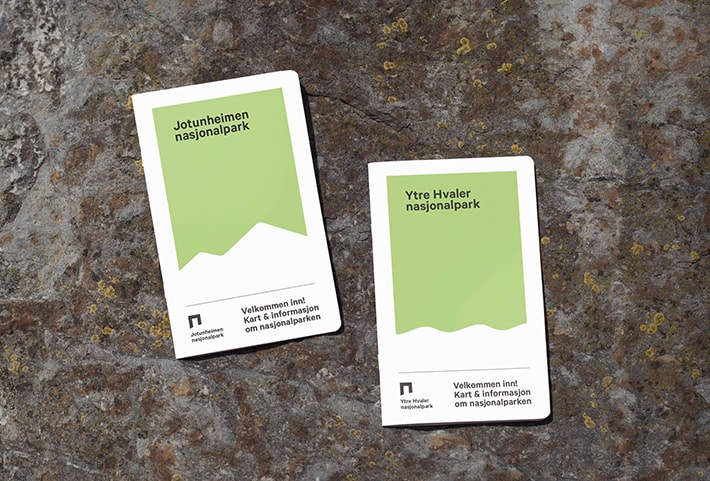The image displays two vertical informational cards, likely entrance or introductory signs for nature parks, characterized by a clean, minimalist design. The use of a soft, muted green against a white background conveys a sense of nature, clarity, and official guidance.
