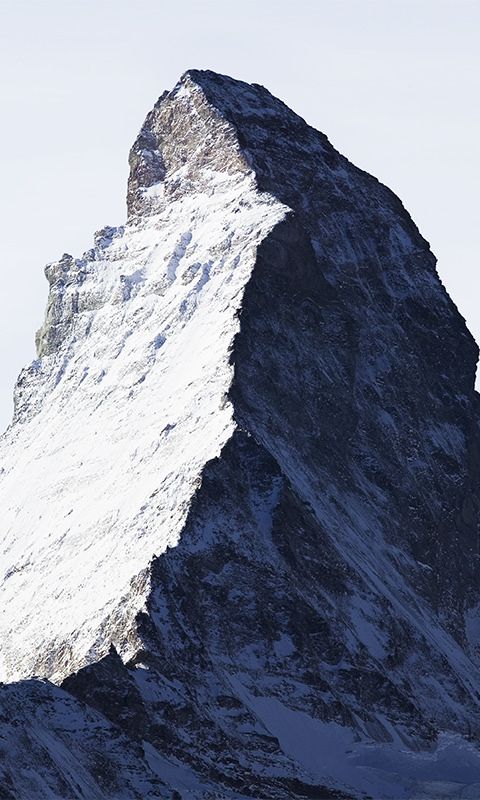 This image utilizes dramatic chiaroscuro to emphasize the rugged scale and imposing nature of a mountain peak. The stark contrast between the sunlit snow face and the deep shadow creates a powerful, vertical composition that evokes themes of solitude and raw natural power.