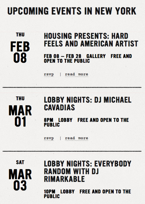 The poster utilizes a stark, minimalist design with high contrast, relying heavily on black text against a white background to convey essential event information. The layout is clean and hierarchical, clearly separating different events using ample negative space.