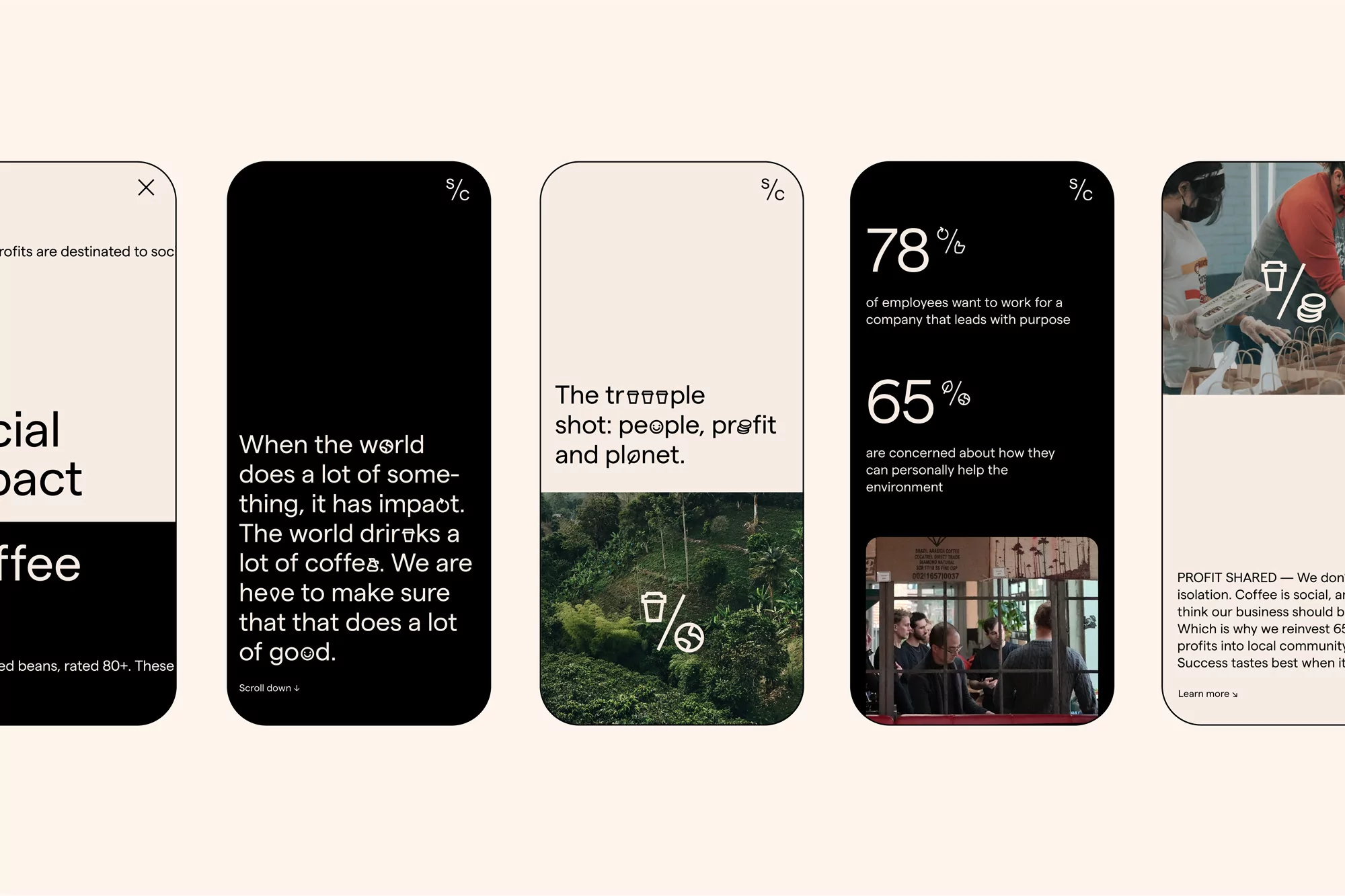 This set of mockups showcases a modern, high-contrast user interface design utilizing dark mode principles to present social impact data. The visual language is clean and professional, relying on clear typography and subtle imagery to convey serious information effectively. The overall feel is grounded, transparent, and focused on measurable outcomes.