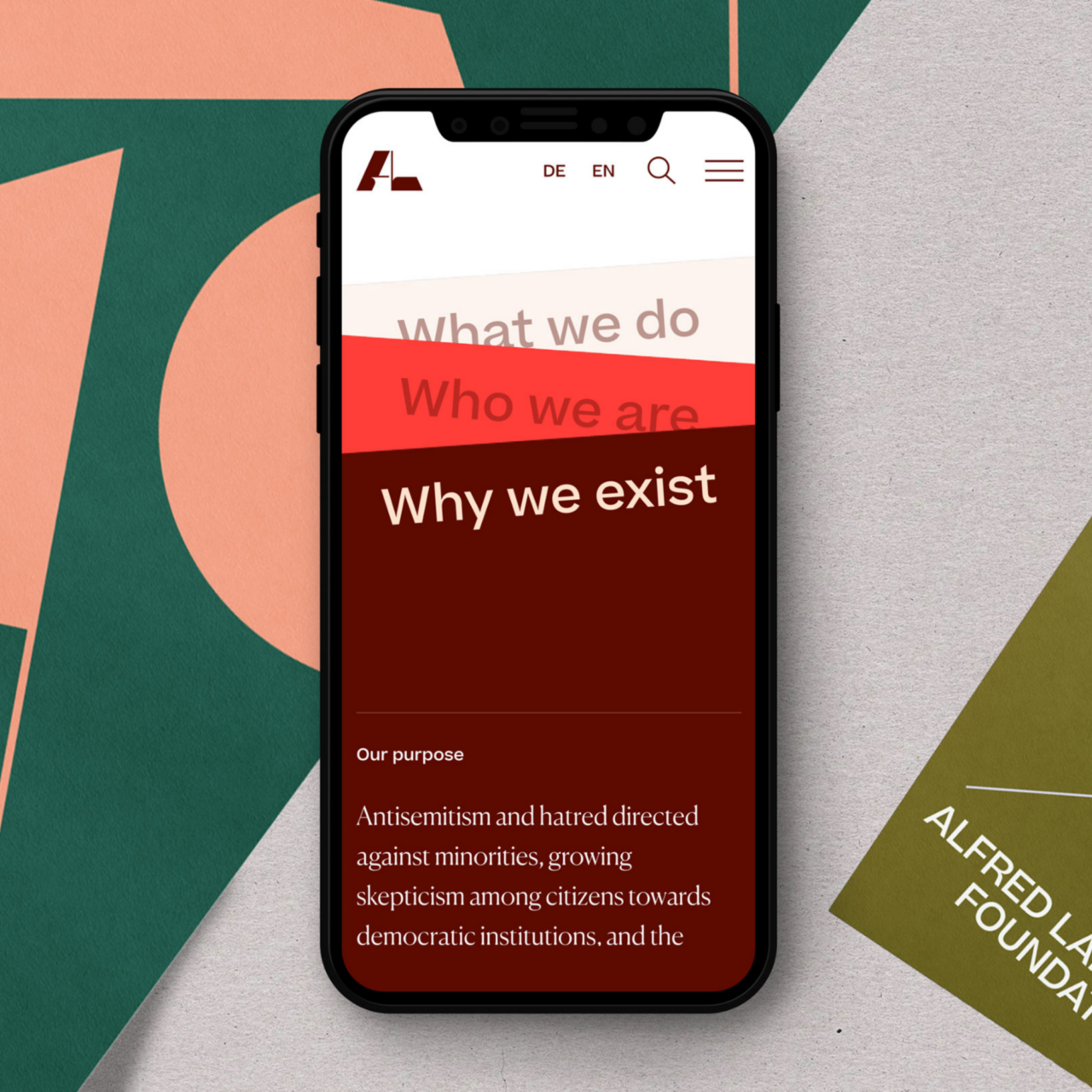 A modern mobile interface design featuring a layered, geometric aesthetic with bold color blocking and contemporary navigation. The design uses a sophisticated palette of deep jewel tones and warm neutrals, presenting organizational messaging through a hierarchical text structure on a smartphone mockup.