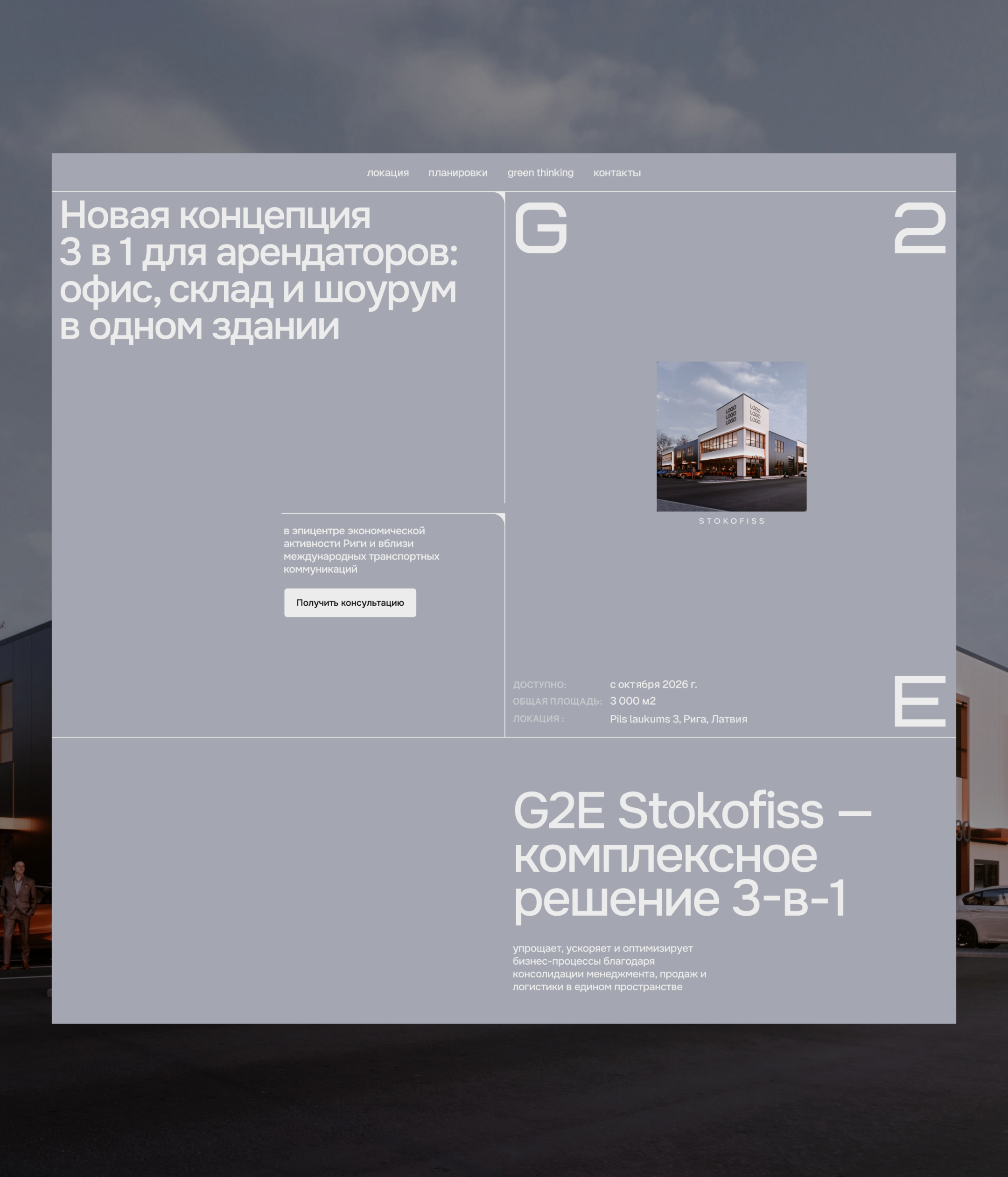The design is clean, modern, and corporate, utilizing a muted grayscale palette with strong geometric divisions. It conveys professionalism and solidity through balanced typography and ample negative space, suggesting a focus on commercial real estate or business solutions.