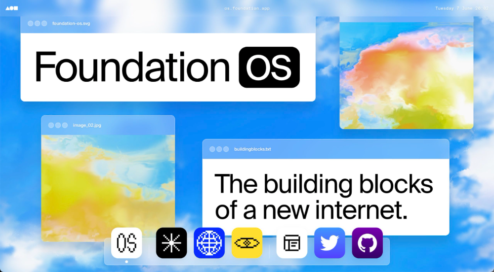 The design presents a clean, modern, and slightly abstract interface concept, utilizing bright, warm colors against a cool blue background. The visual language is bold and uses large typography to establish a strong brand identity for 'Foundation OS'.