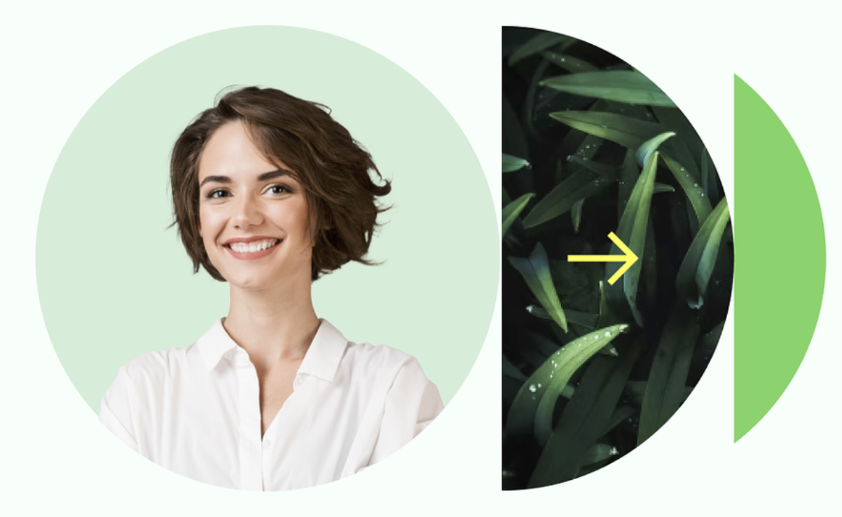 A modern, minimalist comparison layout featuring a professional portrait on the left contrasted with organic botanical imagery on the right, connected by a forward-pointing arrow. The design employs circular framing and a clean, contemporary aesthetic that suggests transformation, growth, or before-and-after narrative.
