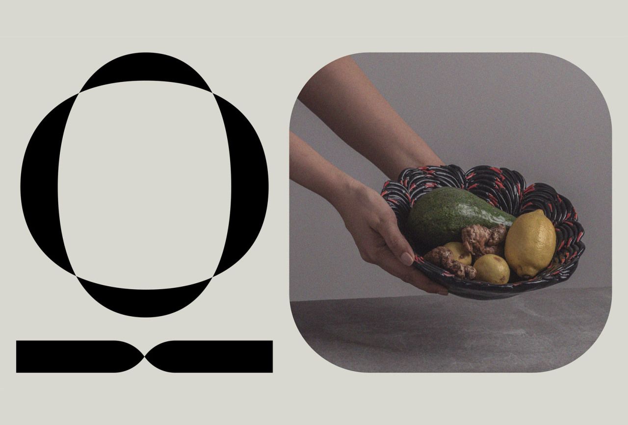This design juxtaposes minimalist graphic shapes with a natural, close-up photograph of food, creating a balanced composition that emphasizes organic texture and clean lines. The visual language relies on muted tones and high contrast to achieve a sophisticated, earthy aesthetic suitable for lifestyle branding.
