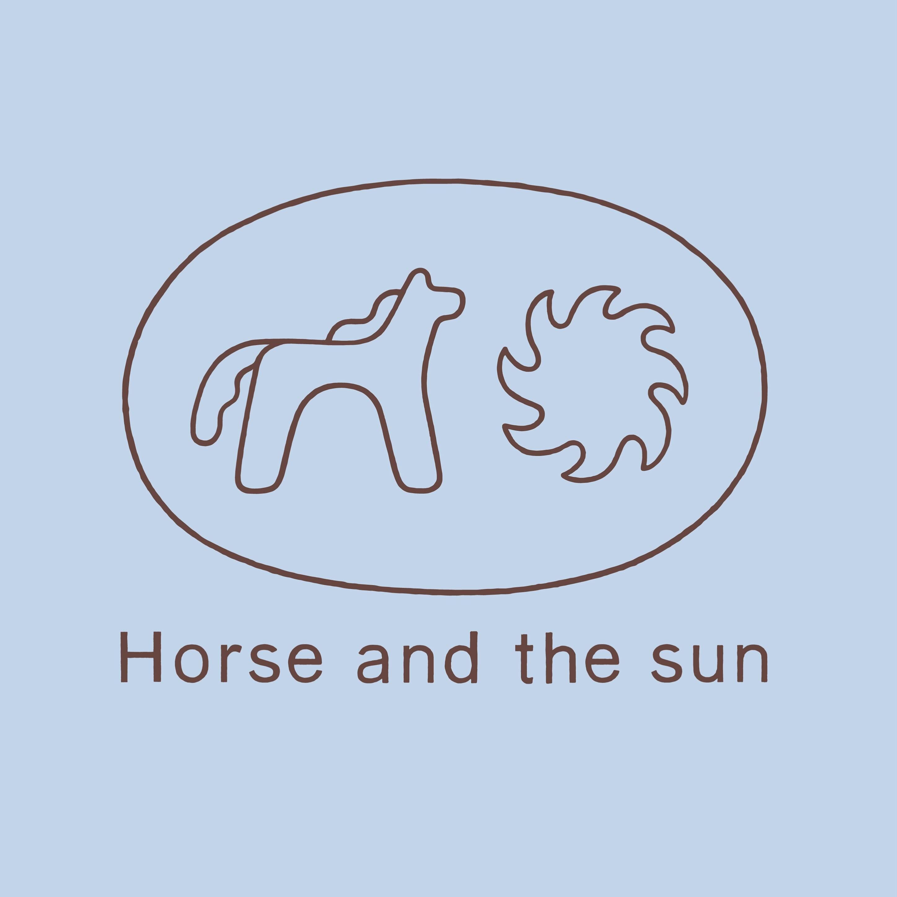 This design utilizes simple, continuous line art to represent a natural theme, combining the silhouette of a horse with a sunburst within an oval frame. The visual language is clean and illustrative, achieving a feeling of classic simplicity and organic connection.