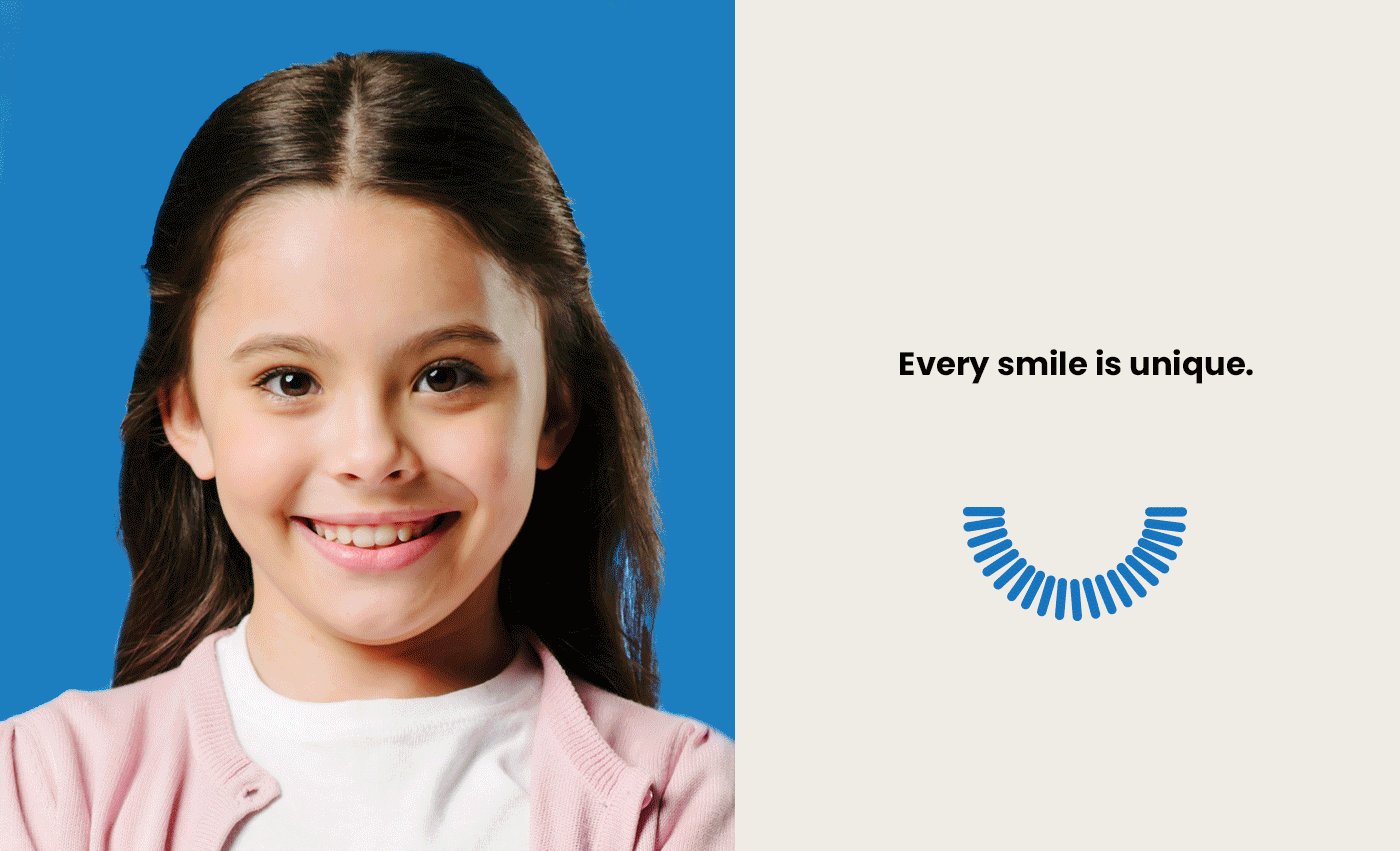 A clean, modern split-screen design featuring a portrait of a smiling child on the left against a vibrant blue background, paired with minimalist typography and an abstract smile icon on the right. The composition balances human warmth with contemporary graphic design, creating an approachable and optimistic visual narrative.