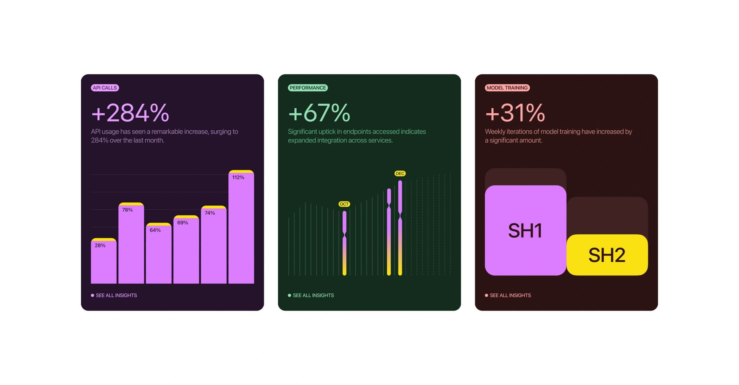 The image displays three distinct, dark-themed data cards presented in a clean, modern dashboard style. The design uses vibrant accent colors (purple/pink and green) against a dark background to highlight positive performance metrics effectively.