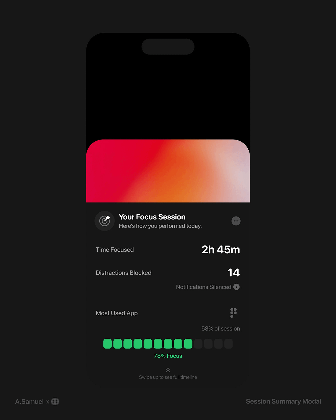 The interface presents a clean, dark-mode design with a vibrant gradient as the primary focal point. It uses clear segmentation and subtle use of color to convey performance metrics in a modern, data-driven manner.