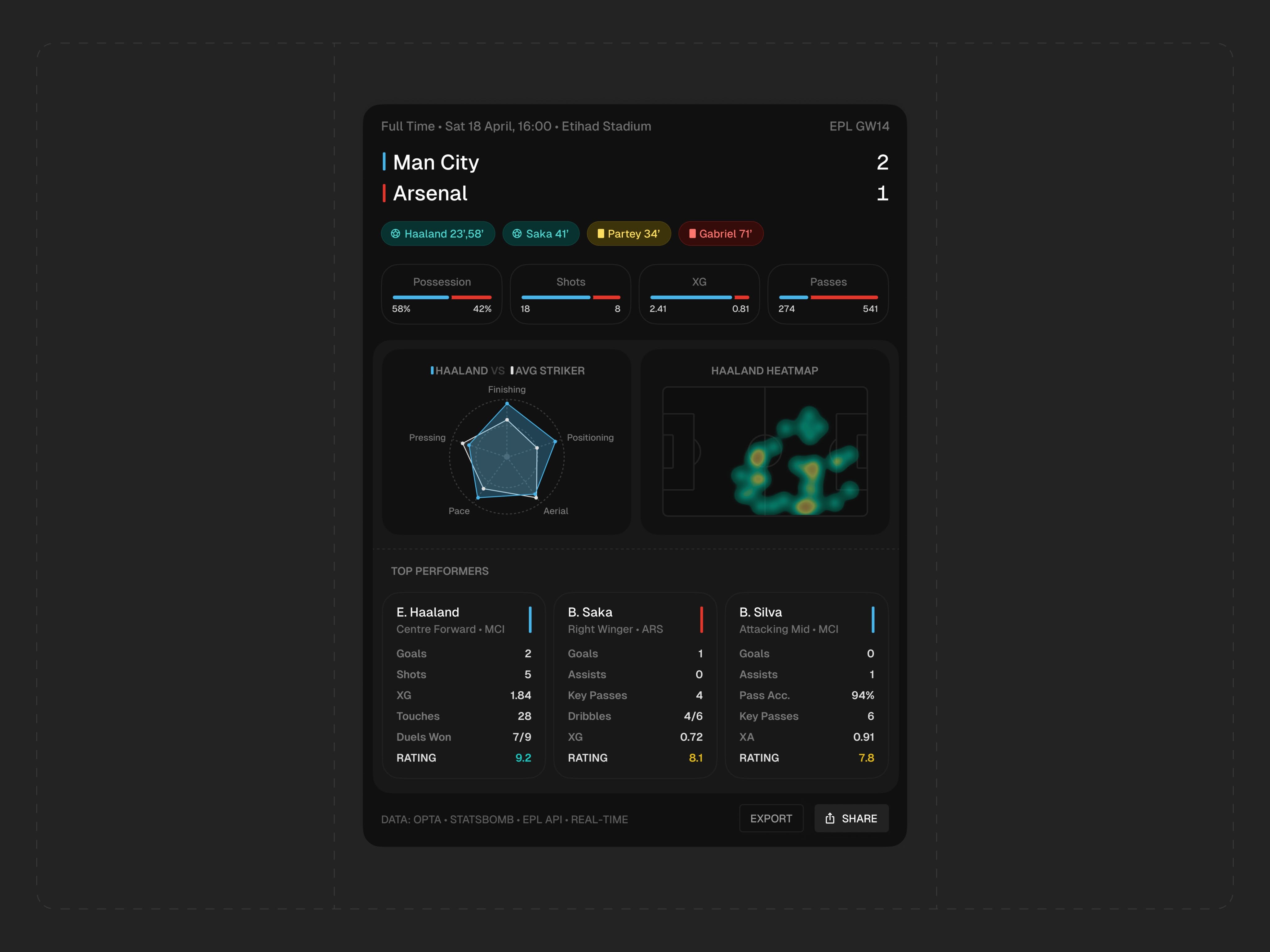This design utilizes a dark mode aesthetic to present complex sports statistics clearly and professionally. The visual language is clean, utilizing high contrast between dark backgrounds and vibrant accent colors to prioritize data readability. The overall feel is modern, analytical, and focused on performance tracking.