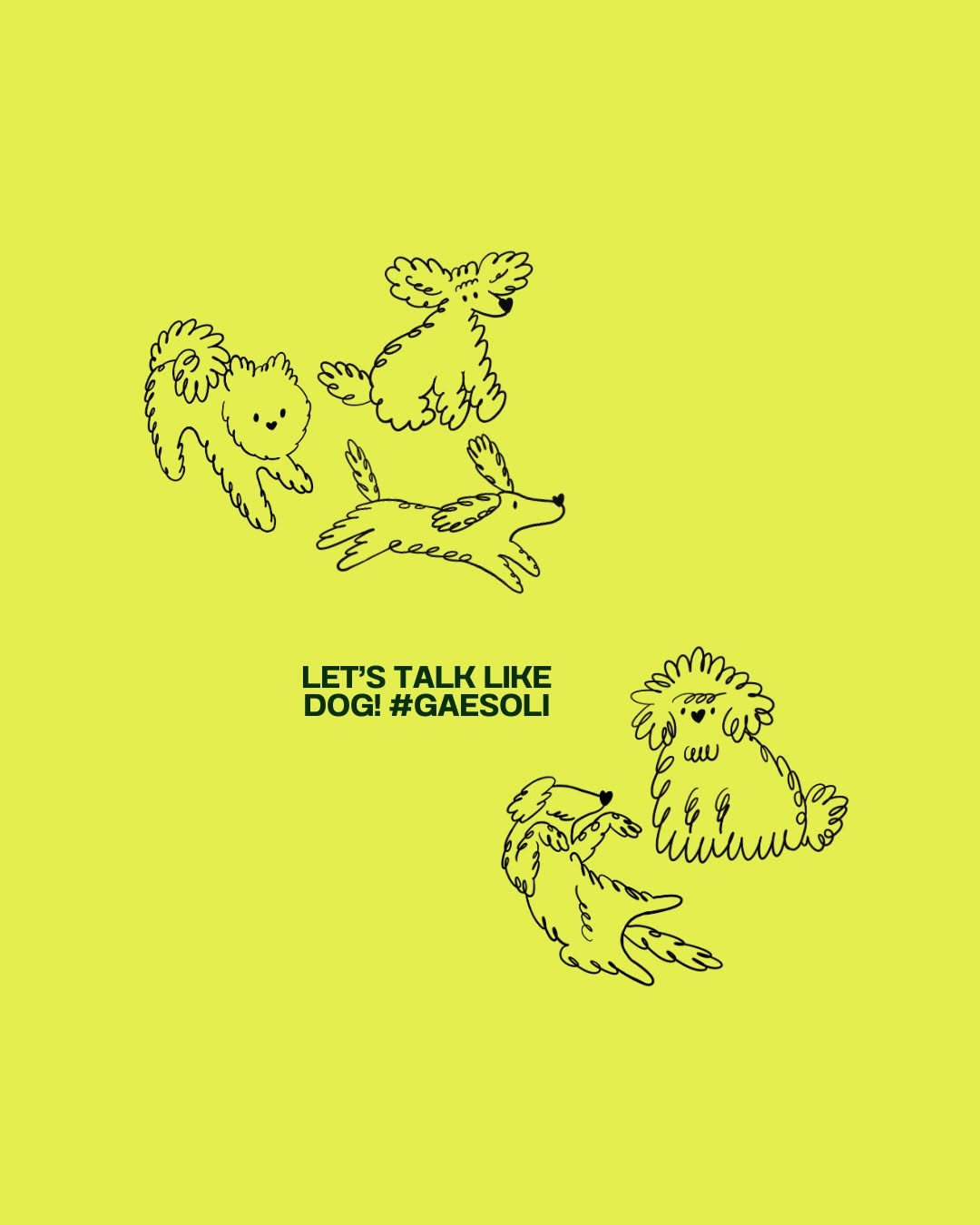 This design features whimsical line drawings of various dogs rendered in a simple, continuous line art style against a pale yellow background. The visual language is light and organic, suggesting playfulness and gentle charm through the sketched aesthetic.