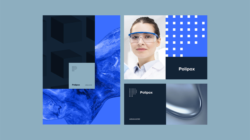 The image presents a clean, modern, and professional visual identity, likely for a medical or scientific product named 'Polipox'. It uses a strong contrast between deep blues, dark grays/blacks, and bright white elements to convey trust and precision.