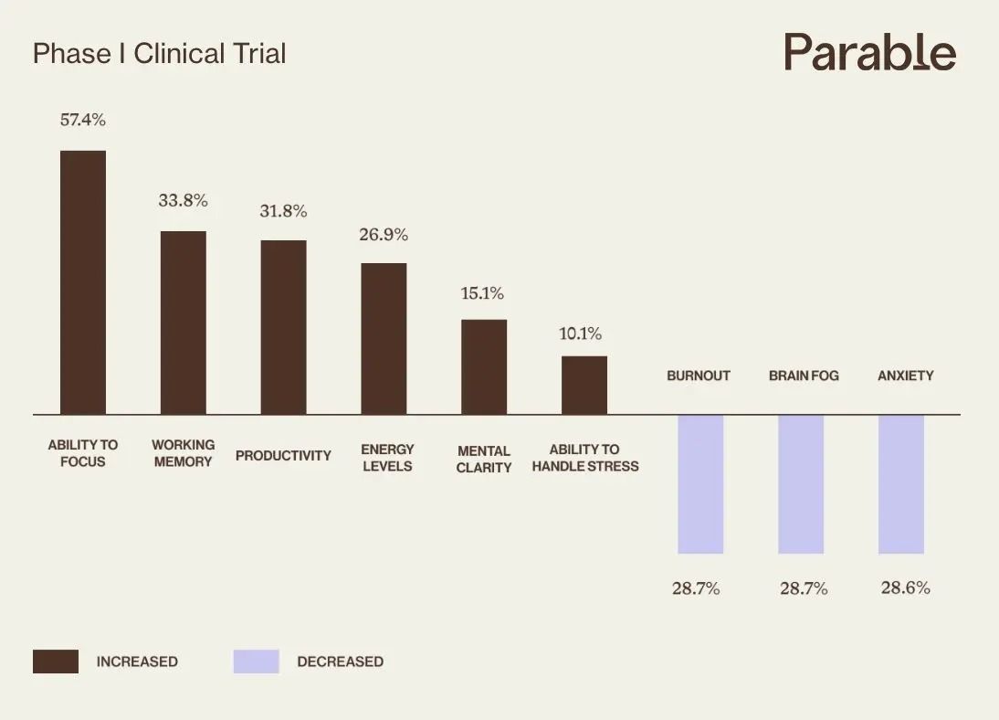 This is a clean, data-driven bar chart presenting clinical trial results for a drug named 'Parable'. The design is minimalist, relying heavily on dark brown bars against a light background to clearly convey quantitative comparisons across various metrics.
