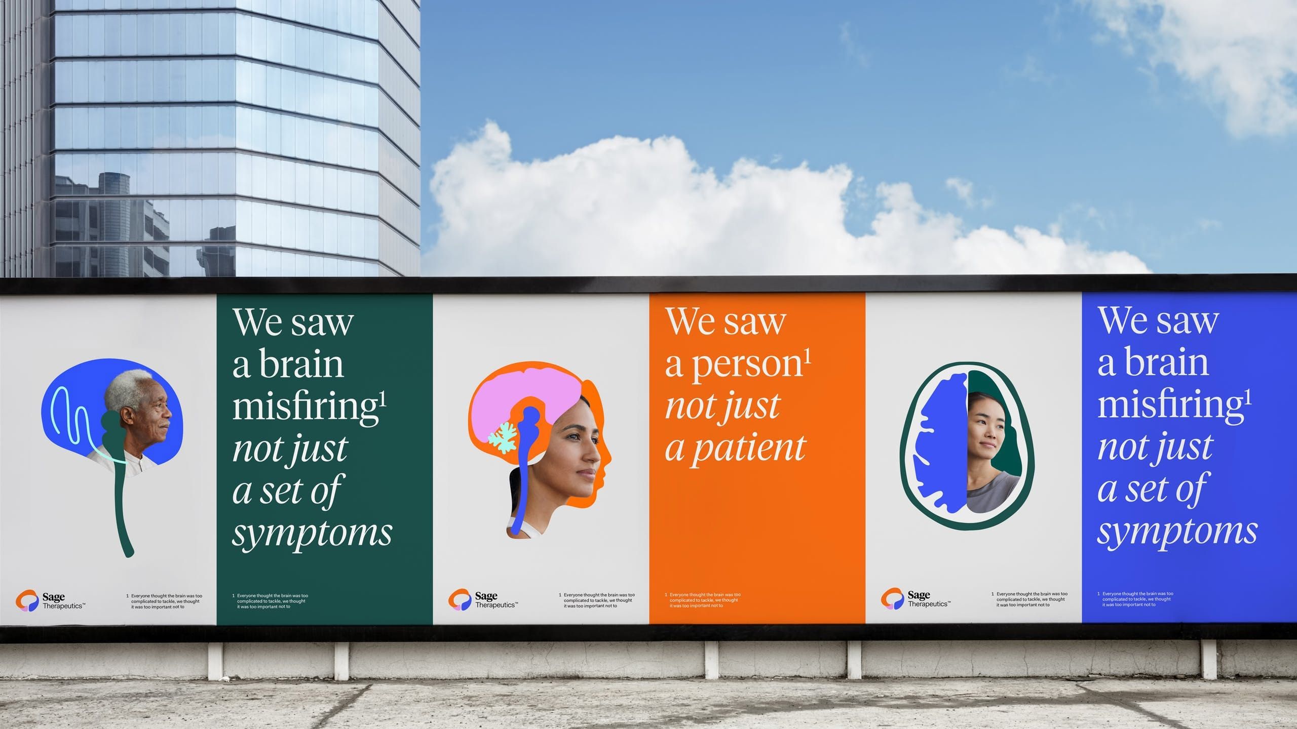 A modern healthcare campaign featuring bold, colorful billboard panels with illustrated head profiles and contrasting typography. The design uses vibrant color blocking and contemporary illustration to communicate medical insights about brain conditions and patient care.