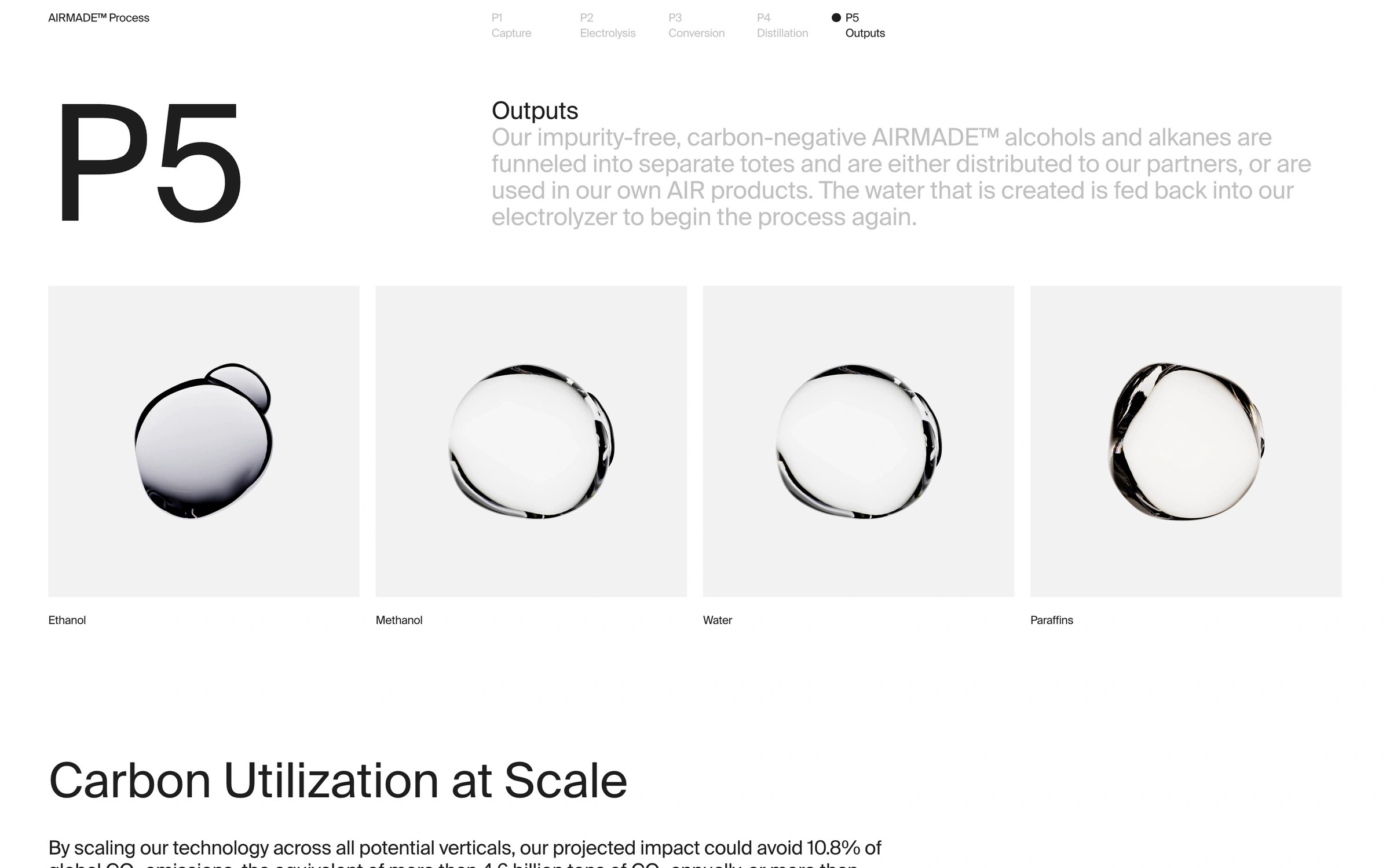The image presents a clean, minimalist technical presentation focusing on chemical outputs. The design relies heavily on simple, circular visual representations to denote different products, suggesting precision and scientific rigor.