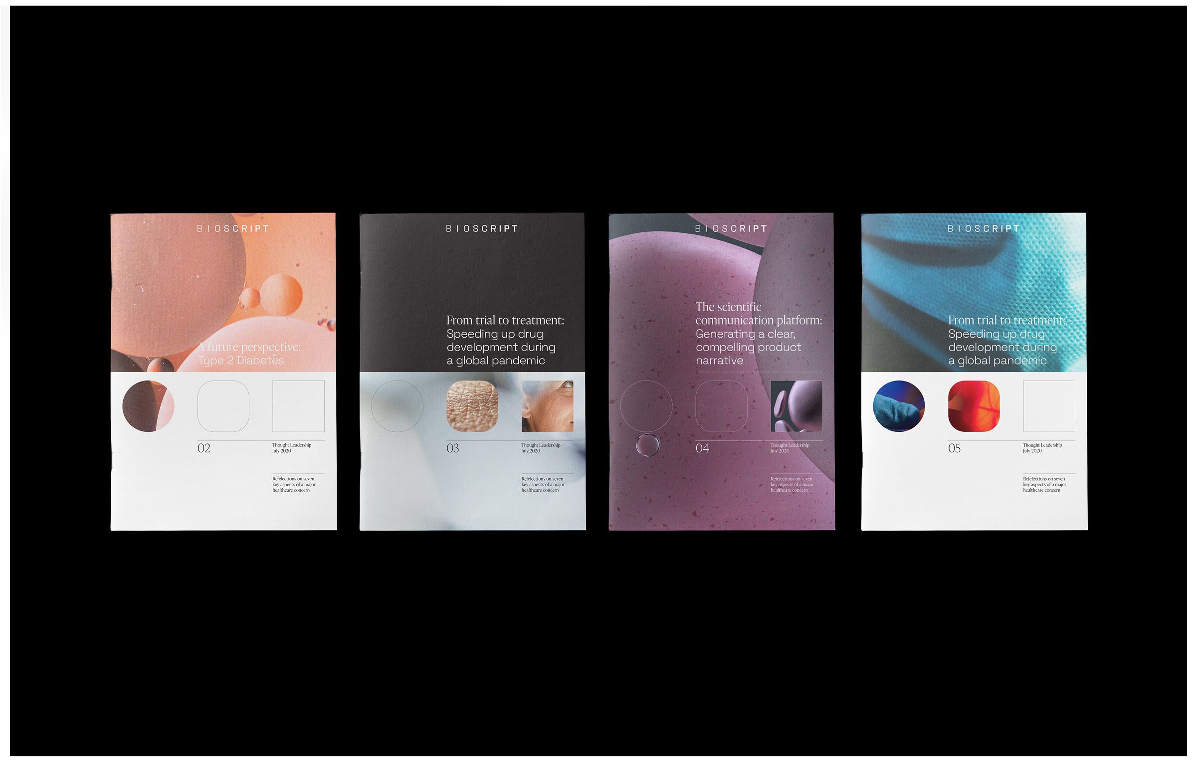 The image displays a series of five minimalist, square-format cards or panels arranged horizontally against a dark background. The design utilizes soft gradients and muted, organic color tones to convey a sense of clinical yet sophisticated product information.