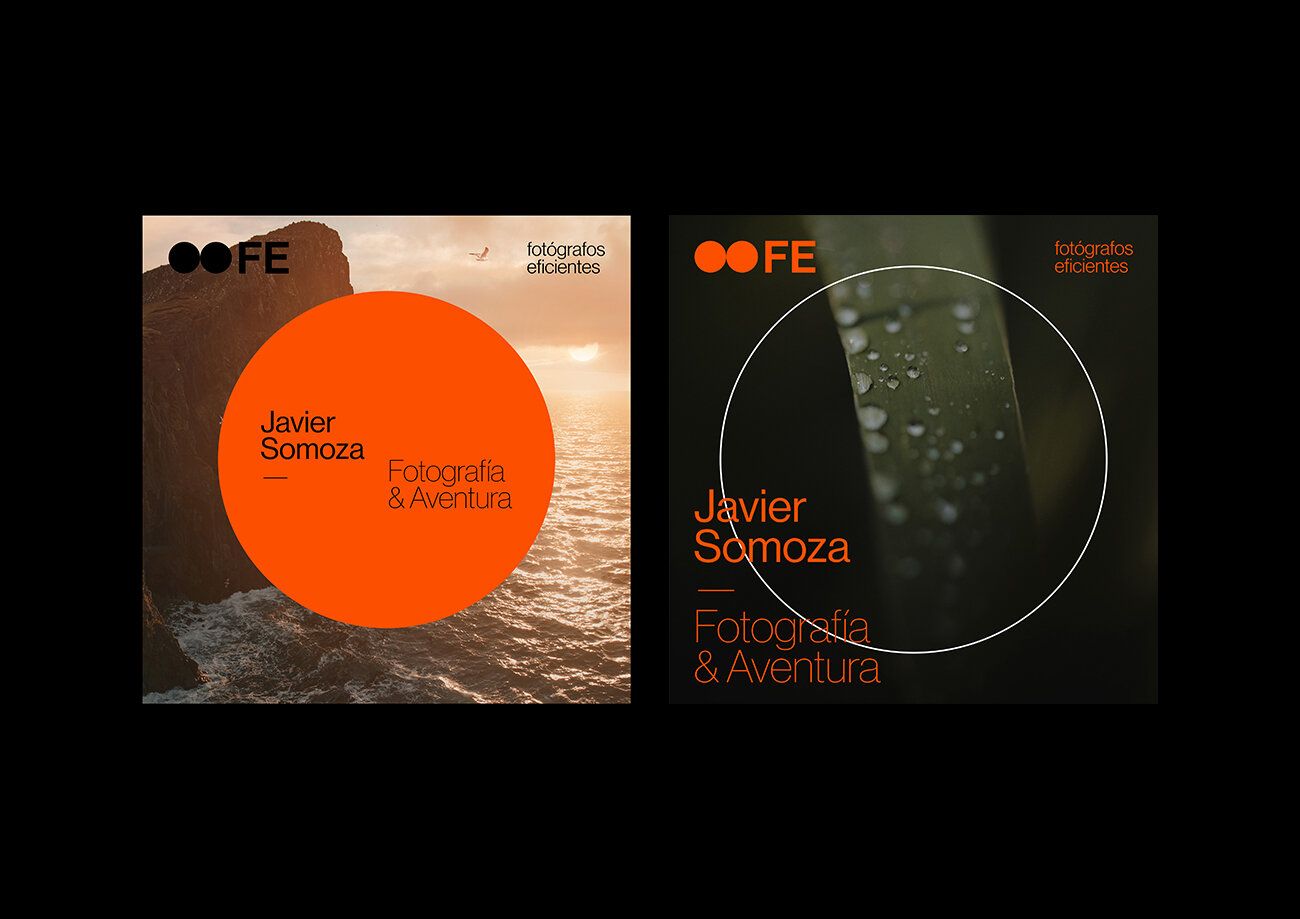 This design utilizes a stark, high-contrast visual language pairing natural textures—such as rock and water droplets—with bold geometric shapes like the large orange circle. The composition is clean and professional, effectively blending dramatic environmental imagery with clear branding elements to establish a theme of adventurous photography.