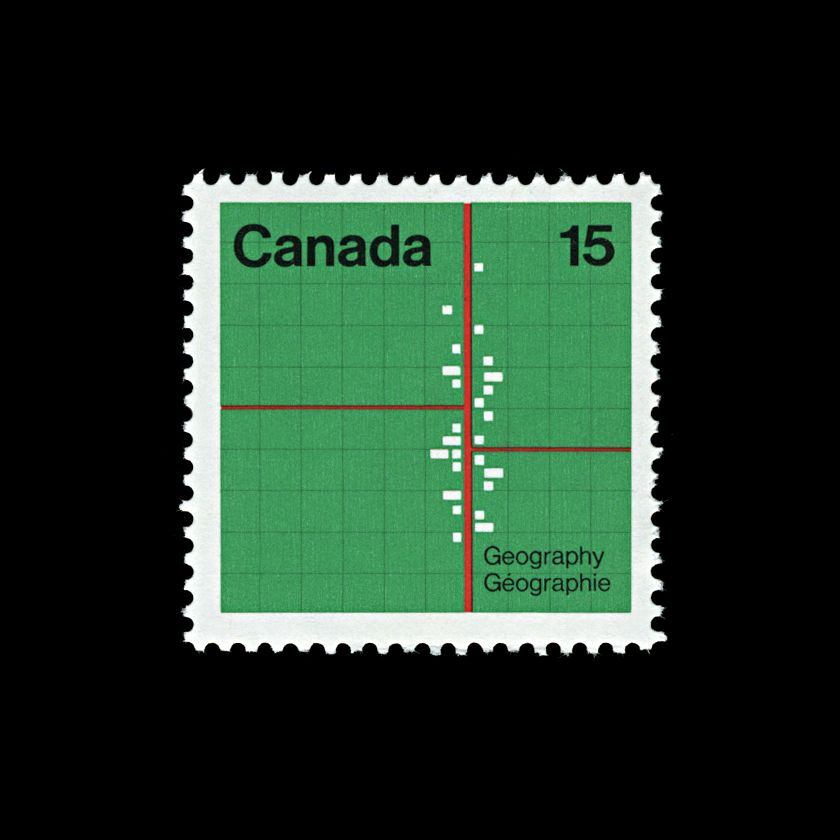 This design utilizes a clean, grid-based structure typical of cartographic or educational graphics to present a postal stamp. The visual language is precise and informational, employing simple geometric elements and contrasting colors to delineate text and design features.
