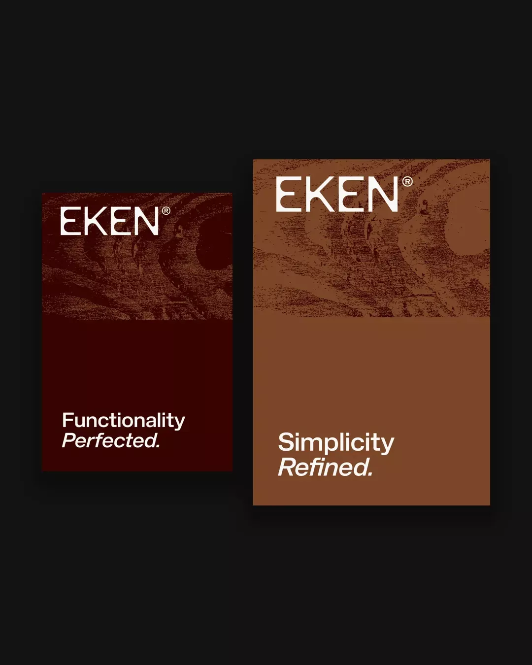 Two minimalist brand cards for EKEN featuring a sophisticated two-tone layout with textured topography imagery and clean typography. The design employs a restrained color palette and balanced composition that conveys premium quality and modern elegance.