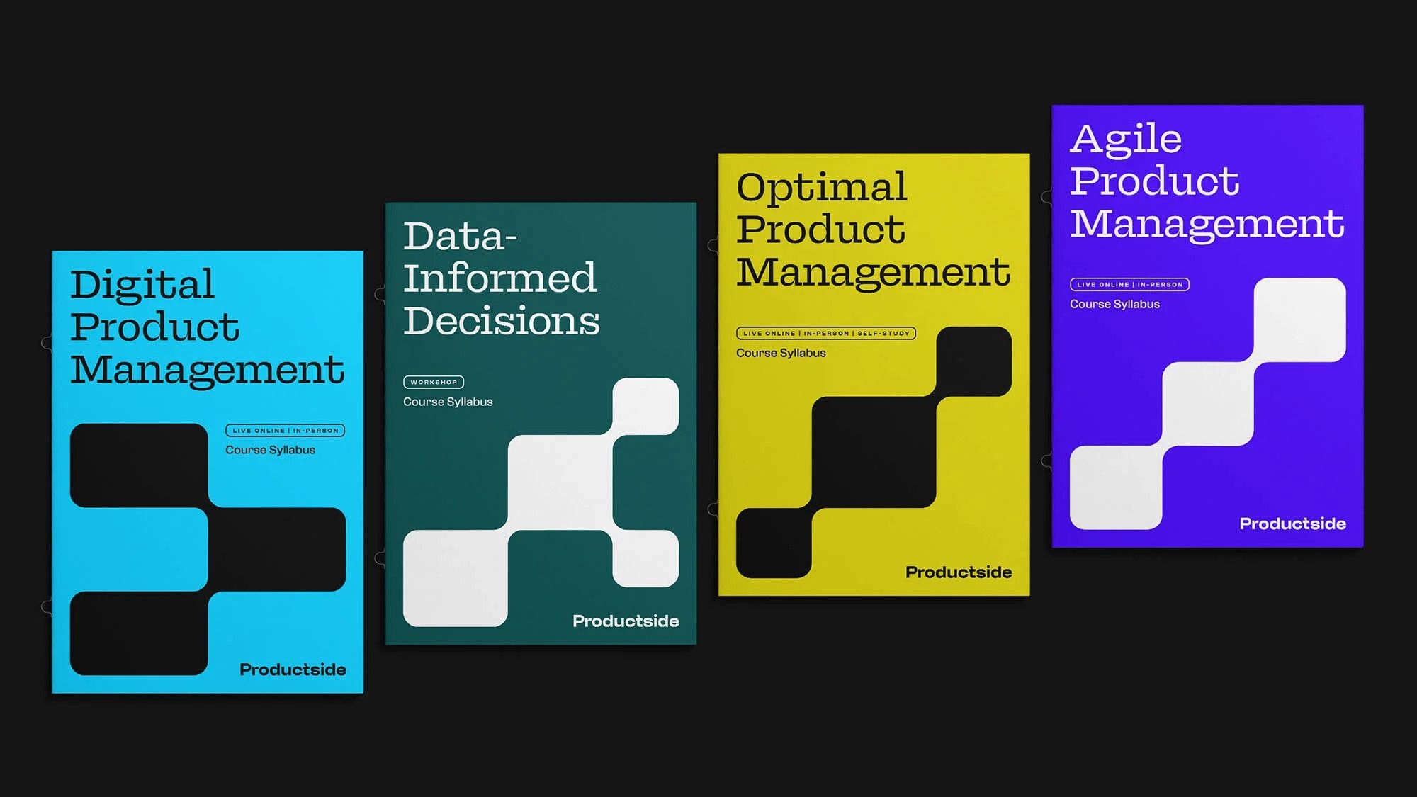 The image presents a clean, modern, and professional set of four distinct visual modules, likely representing different product management concepts. It uses strong geometric shapes and a high-contrast color scheme to create a sense of clarity and structured information.