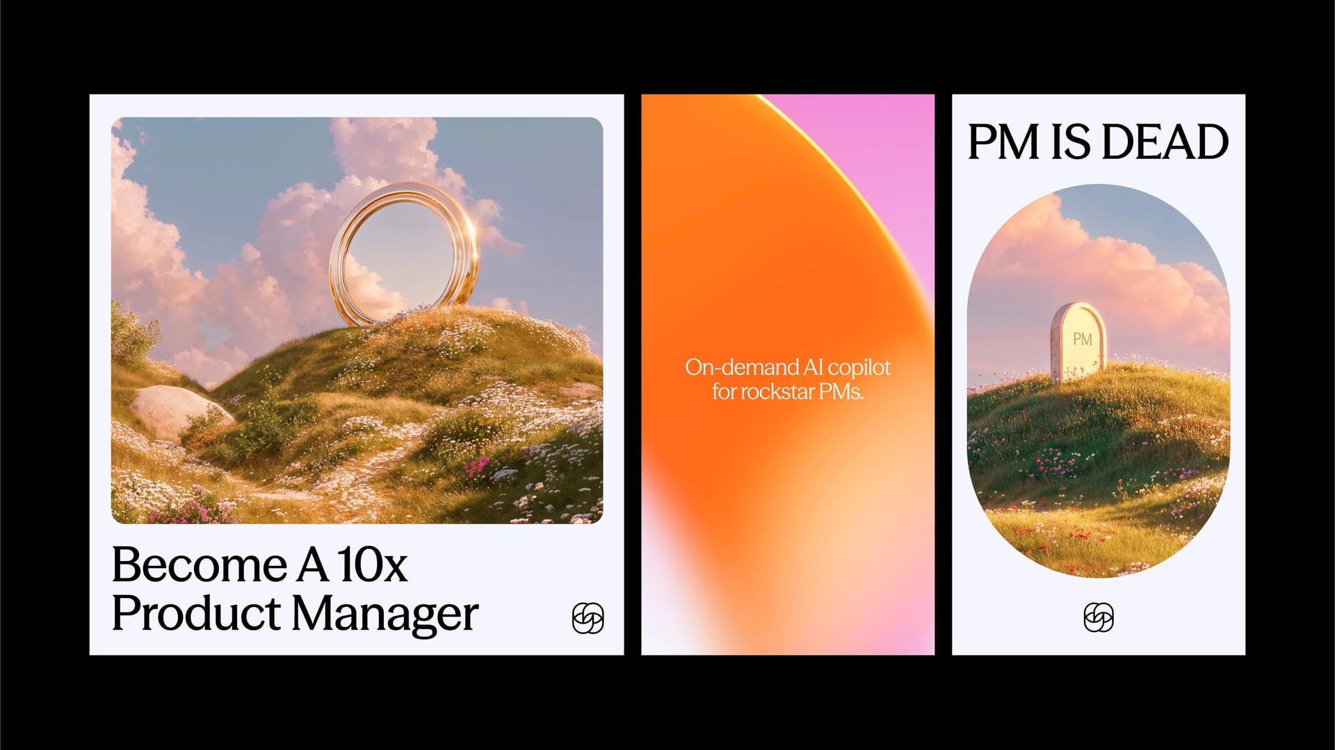 This is a striking, high-contrast visual presentation utilizing nature imagery juxtaposed with bold textual statements. The design employs smooth gradients and minimalist composition to create a sense of aspiration, disruption, and confidence in the product development industry.