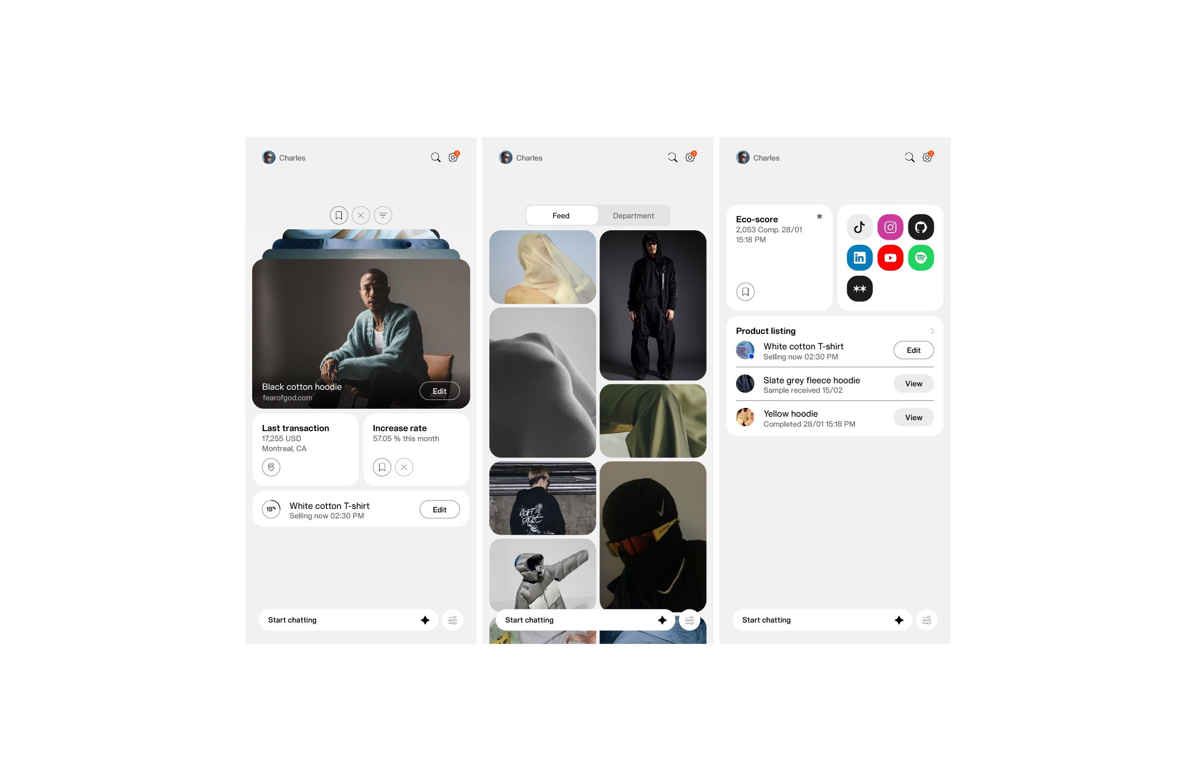 This interface features a clean, modular design optimized for displaying product listings and user metrics. The visual language is professional and functional, prioritizing clear information hierarchy through organized card layouts and ample negative space.