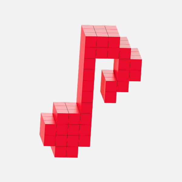 This image features a vibrant, three-dimensional representation of a musical note constructed from modular, block-like units. The design emphasizes geometric structure and materiality, presenting a solid, playful form against a minimalist background.