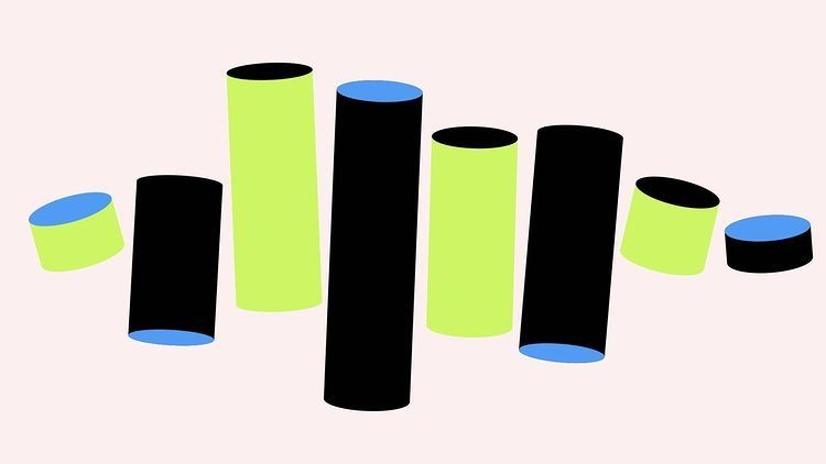 This image presents a minimalist, abstract composition using vertical cylindrical shapes of varying heights and solid colors. The design relies on simple geometric forms to create a sense of rhythm and visual hierarchy through height variation.