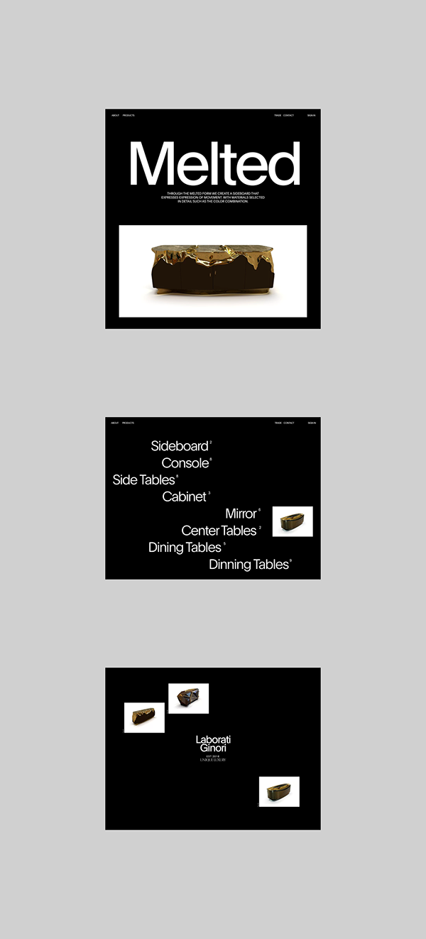 The image presents a minimalist, high-contrast design featuring stark black and white elements. The layout is clean and modular, suggesting a focus on product or architectural display with a sophisticated, modern aesthetic.