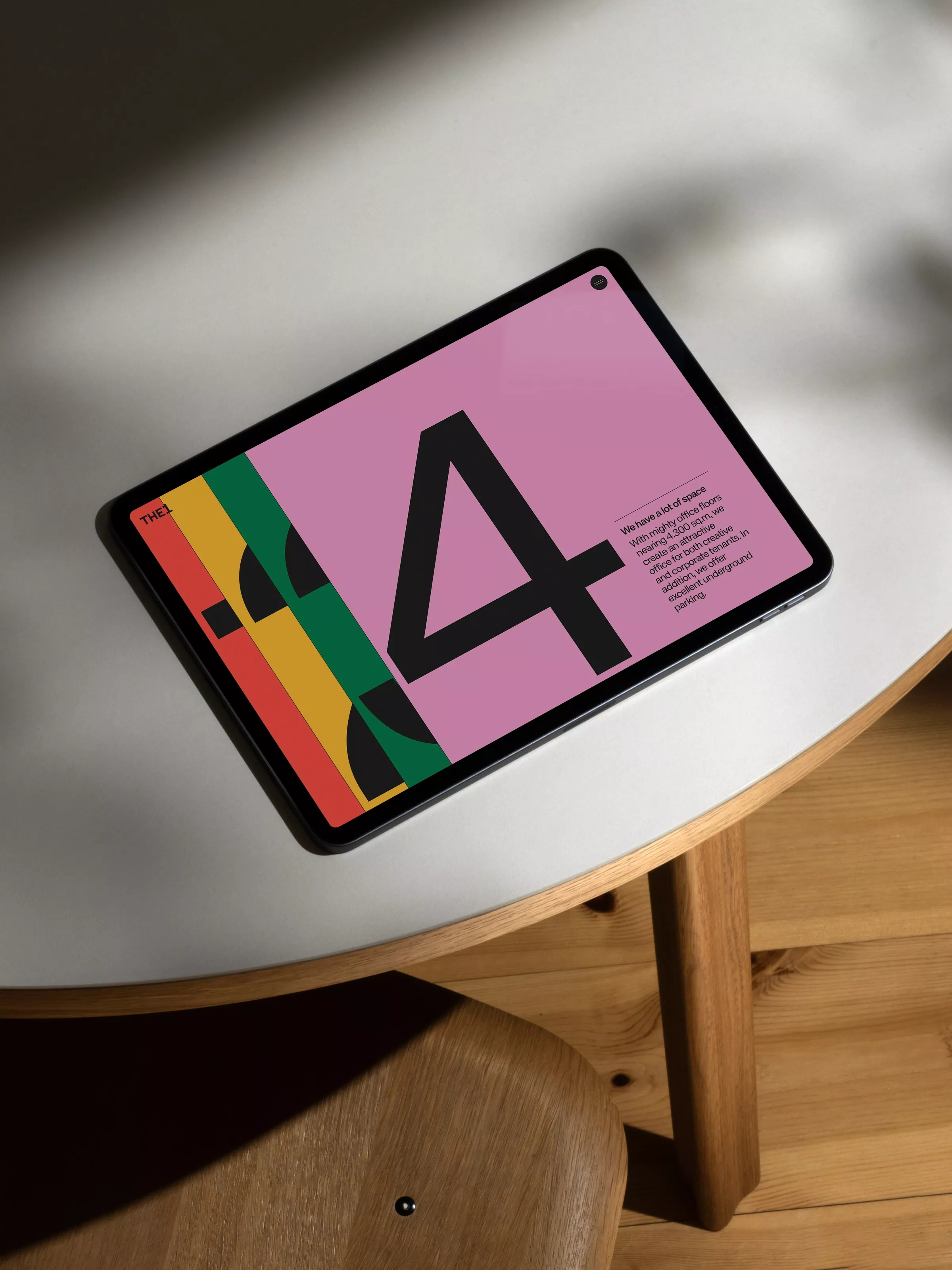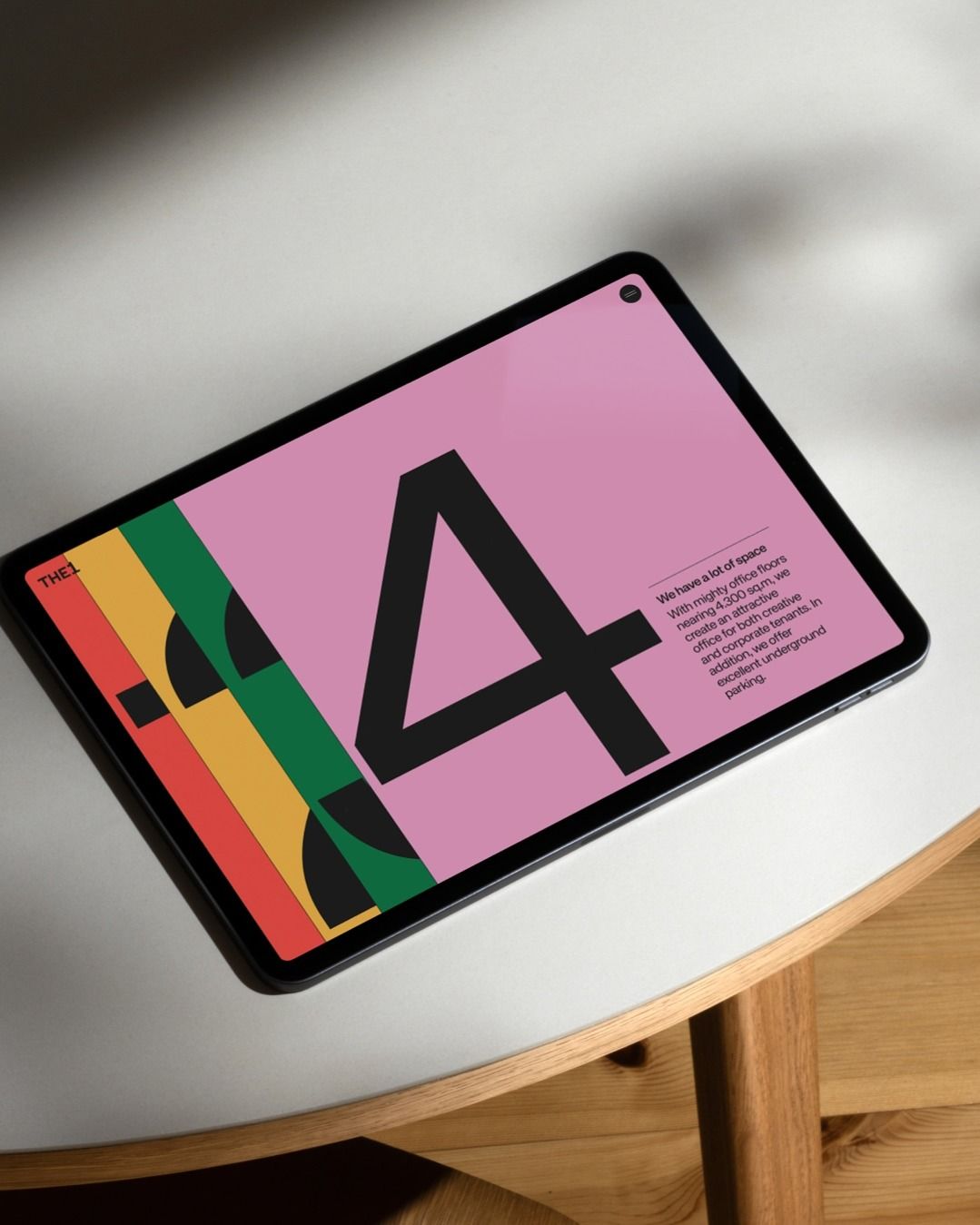 This image showcases a clean, modern design featuring bold geometric color blocking on a digital device. The visual language is minimalist yet vibrant, utilizing strong contrasts between saturated colors and neutral backgrounds to create a highly structured aesthetic.