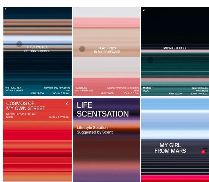 The image presents a grid-like display of product or scent names, characterized by strong horizontal color blocking and clean, modern typography. The design uses a limited palette to create distinct visual segments for each entry, suggesting a premium or curated catalog feel.