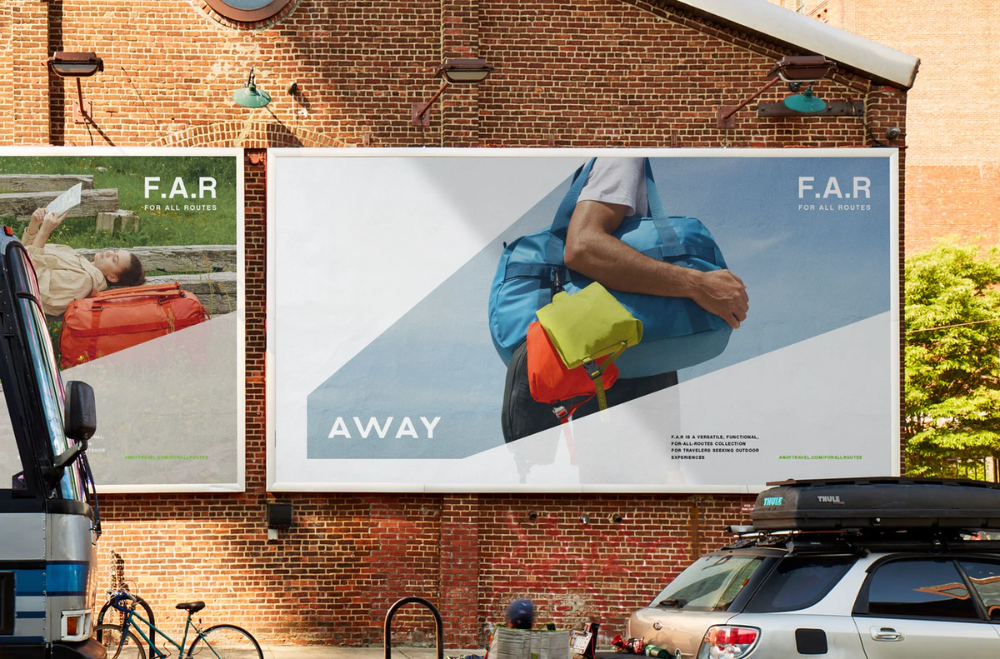 This image features a large, clean advertisement or sign displayed on a brick wall, promoting a product or service named 'F.A.R.' The design is minimalist and modern, using negative space effectively to draw focus to the subject matter and the prominent text.