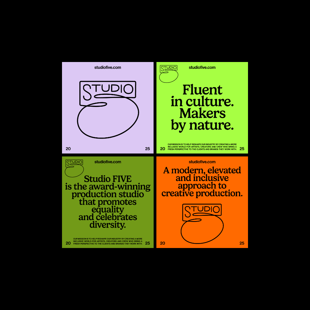 The image presents a clean, modern, and professional visual identity for a studio, utilizing a limited color palette of purple, lime green, and orange against a white background. The design relies on simple line art and strong geometric shapes to convey a sense of expertise and creativity.