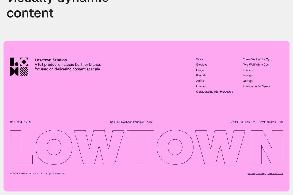 This design utilizes a vibrant pink background to establish a modern, energetic, yet clean visual identity. The layout is highly organized, employing clear typography and white accents to ensure high readability and strong brand presence. The overall feel is professional and creative, suitable for a studio or production company.
