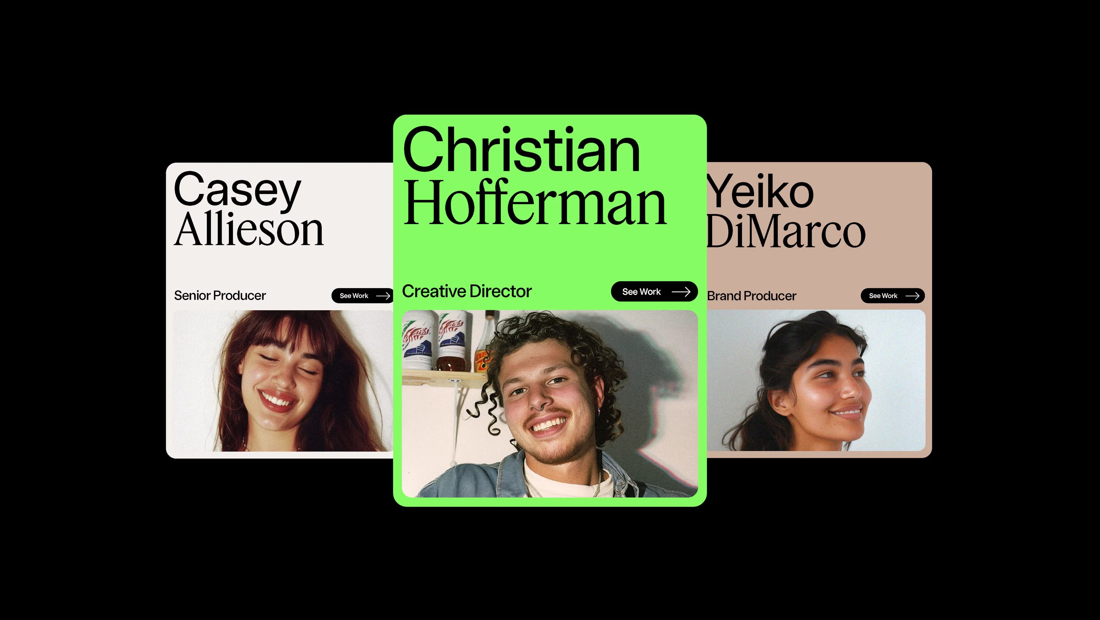 This visual is a clean, professional portfolio display utilizing a minimalist design approach. It uses soft pastel colors for framing and relies on clear typography and high-quality photography to establish a modern, creative yet corporate feel.