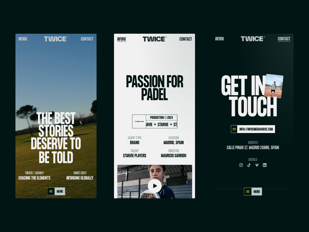 The design is clean, modern, and bold, utilizing high contrast between white text and a deep blue background. It employs strong, sans-serif typography to convey a professional and cinematic identity.